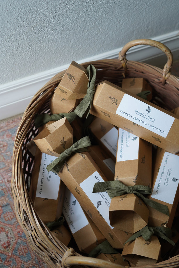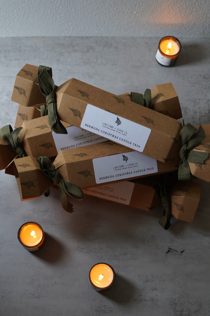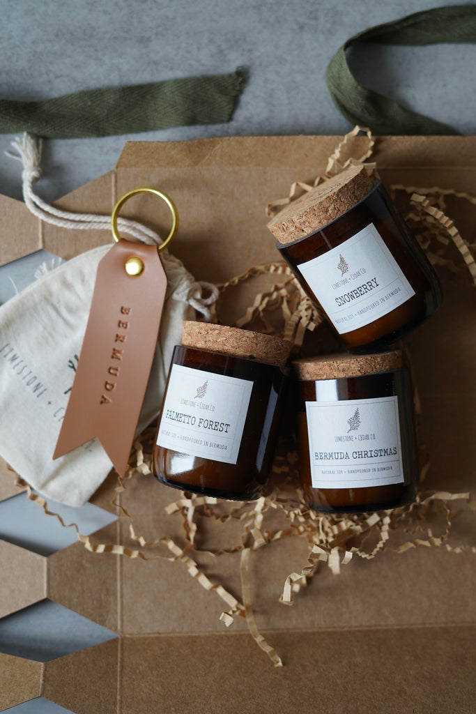 Inside you’ll find three handmade mini Christmas soy wax candles and a vegan leather Bermuda keychain - all tucked inside the sweetest cracker-shaped gift box, finished with cotton bows.